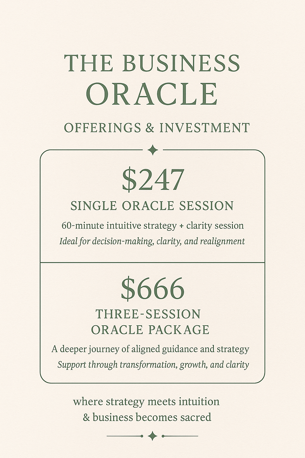 The Business Oracle is a signature offering designed for entrepreneurs who are ready to move beyond hustle culture and build a business that feels grounded, aligned, and energetically sustainable.